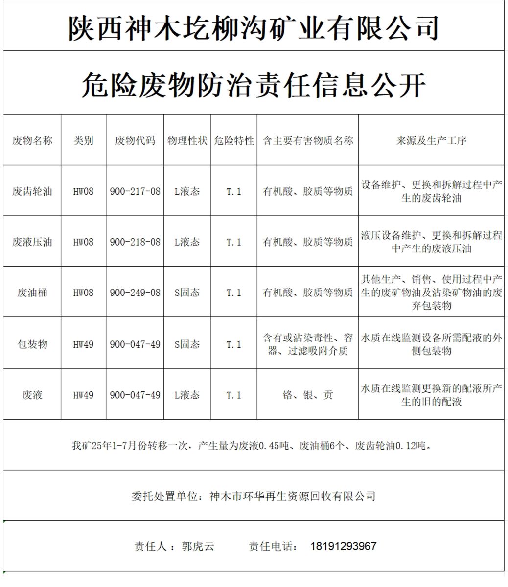 陕西神木圪柳沟矿业有限公司危险废物防治责任信息公开