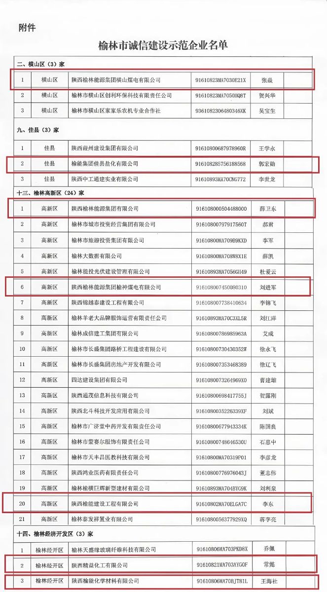 近日,榆林市信用和招投标协会发布《关于授予147 户企业“榆林市诚信建设示范企业”称号的通知》,集团公司、榆神煤电公司、横山煤电公司、精益化工公司、化学材料公司、榆能建设工程公司、佳县盐化公司等企业凭借良好的社会信誉和诚信经营理念被评为“榆林市诚信建设示范企业”。