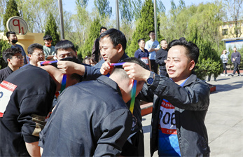 矿长(组织委员)何文飞、财务总监(纪检委员)冯学埃为户外跑步第二名获奖者颁发奖牌并发放奖金。