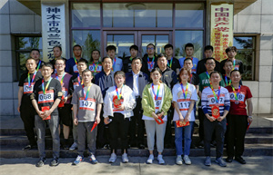 总经理聂占宽、矿长(组织委员)何文飞、财务总监(纪检委员)冯学埃与户外跑步第一名获奖者合影留念。
