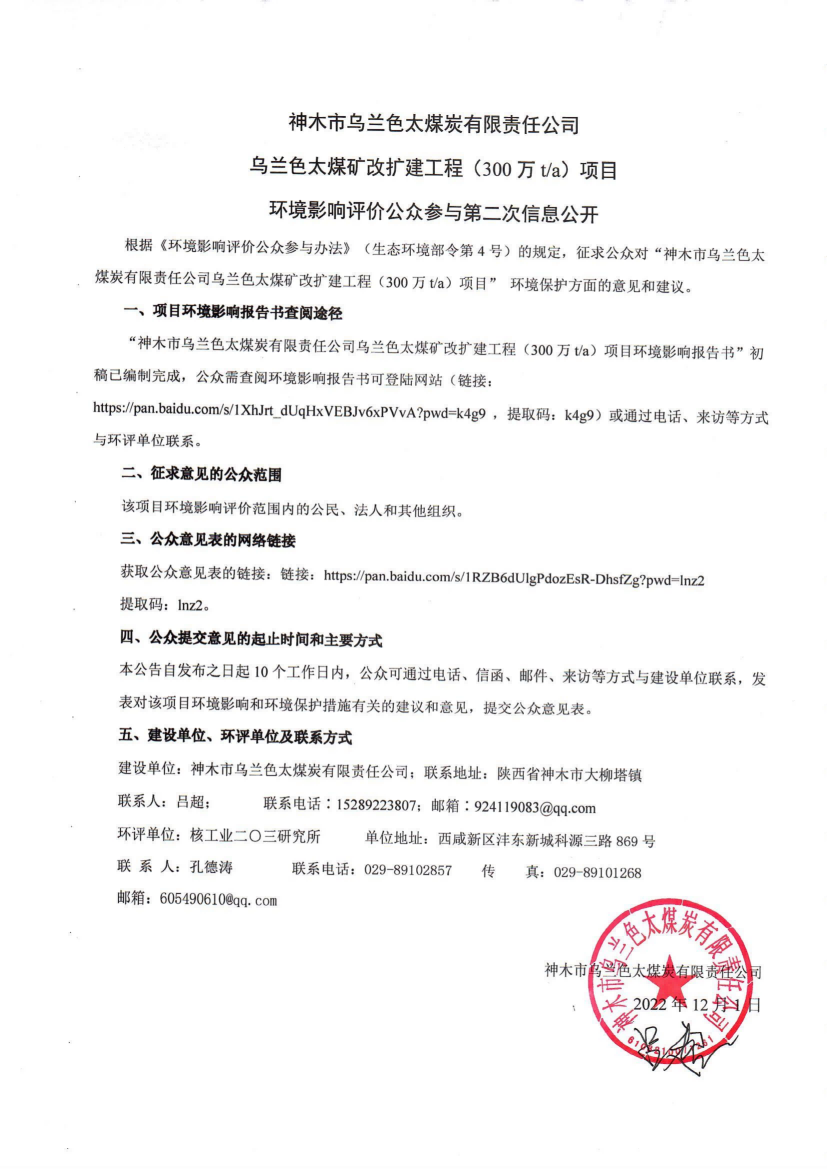 神木市乌兰色太煤炭有限责任公司 乌兰色太煤矿改扩建工程(300万t/a)项目 环境影响评价公众参与第二次信息公开