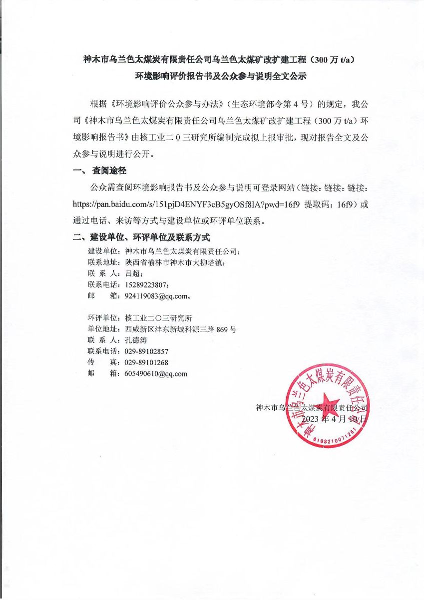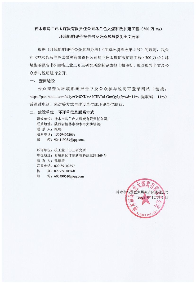 神木市乌兰色太煤炭有限责任公司乌兰色太煤矿改扩建工程(300万t/a) 环境影响评价报告书及公众参与说明全文公示
