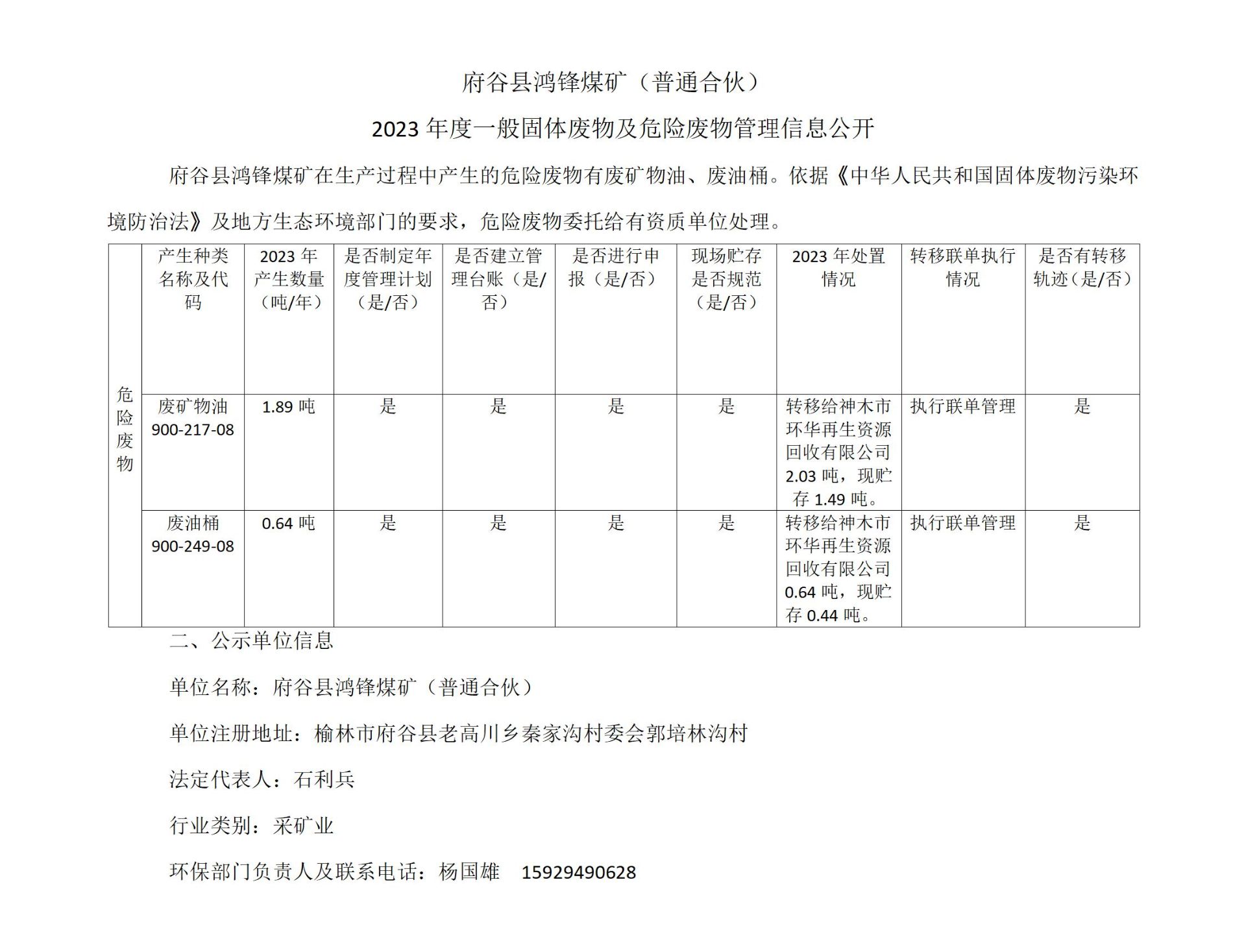 附件一:府谷县鸿锋煤矿(普通合伙) 2023年度一般固体废物及危险废物管理信息公开