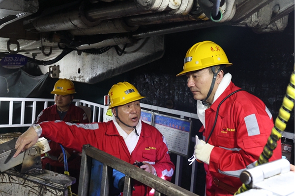 在曹家滩矿业公司,张文琪来到智能调度指挥中心、智慧餐厅、综采二队培训室等地,了解煤矿智能化建设、生产运输系统布局、智能快掘发展、10米超大采高项目建设等情况,听取了“智能矿井、智慧园区、一流企业”整体介绍,了解了矿区安全生产、能源保供等情况。更换作衣,并接受入井安全培训后,张文琪深入井下122105综采工作面,了解生产和安全情况,并与当班工人亲切交谈。在井下深度水处理站,张文琪肯定了井下水处理实现全自动、无人值守和循环利用的成绩。