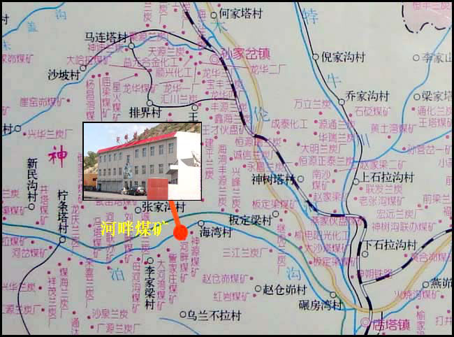 神木市孙家岔镇海湾村河畔煤矿位于神木市孙家岔镇海湾村,行政区划隶属于神木市孙家岔镇所辖。矿井始建于1995年,原设计生产能力4万吨/年,采煤方法为房柱式炮采。矿井范围由8个拐点坐标组成,井田面积为3.7298km2,该井田批准开采3-1、4-2、4-3、4-4、5-2共五层煤。