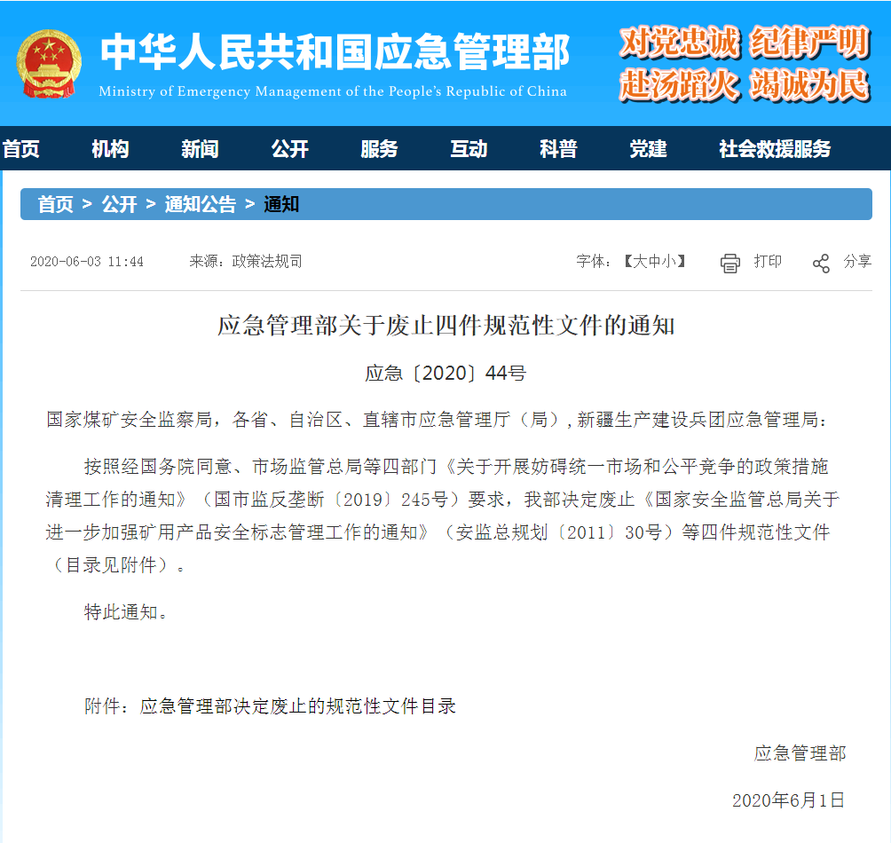 按照经国务院同意、市场监管总局等四部门《关于开展妨碍统一市场和公平竞争的政策措施清理工作的通知》(国市监反垄断〔2019〕245号)要求,我部决定废止《国家安全监管总局关于进一步加强矿用产品安全标志管理工作的通知》(安监总规划〔2011〕30号)等四件规范性文件(目录见附件)。