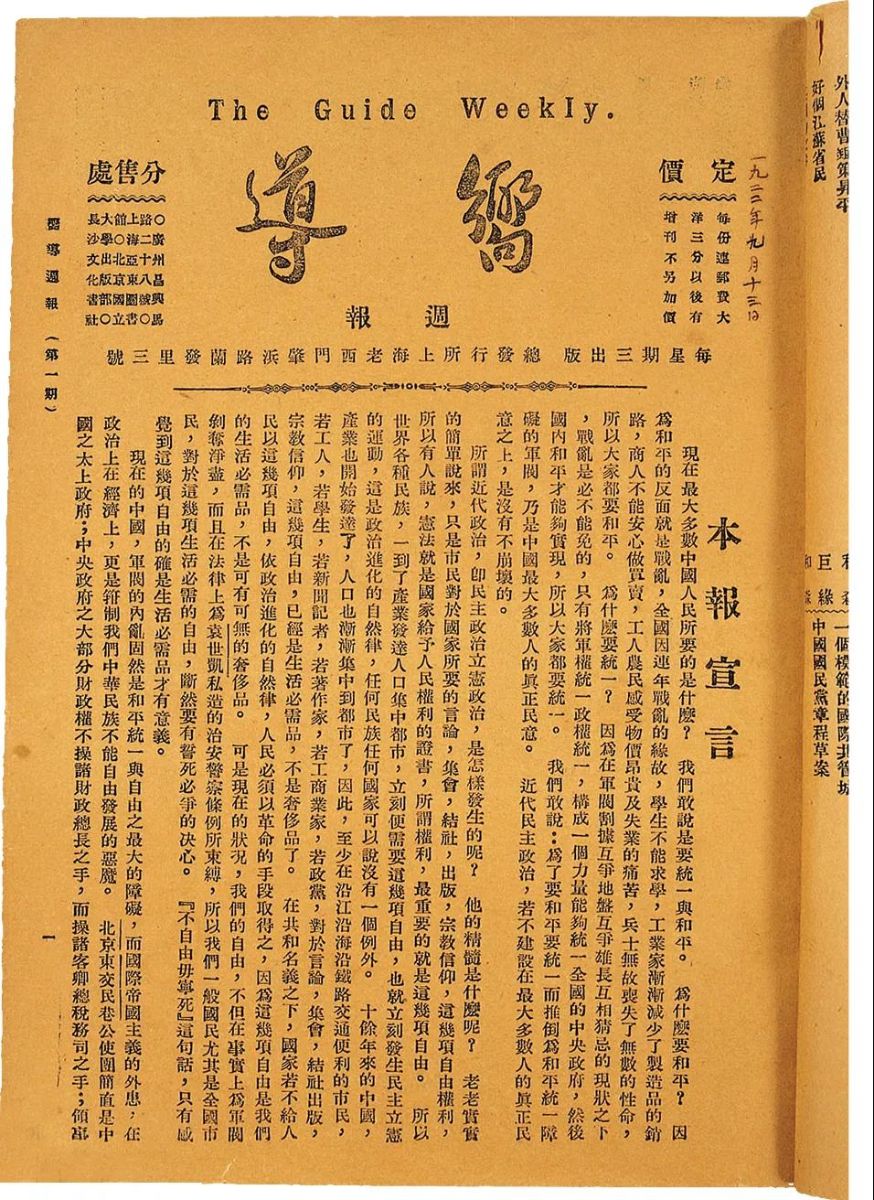 1922年9月13日,中国共产党机关刊物《向导》周报在上海创刊。图为该刊创刊号。