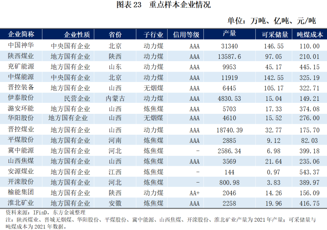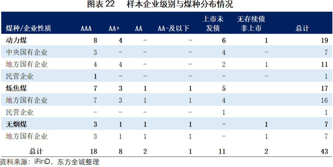 样本企业性质以国有企业为主,其中中央国有企业7家,地方国有企业34家,民营企业2家。发债企业信用等级以AAA和AA+的中高等级企业为主。样本企业以动力煤和炼焦煤企业为主。其中,动力煤企业19家,炼焦煤企业17家,无烟煤企业7家。