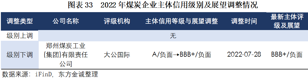 2022年,煤炭企业中共有1家企业级别出现变动。大公国际将郑州煤炭工业(集团)有限责任公司主体信用等级由A/负面下调至BBB+/负面,主要是因为2021年以来,公司及上市子公司多次受到监管机构通报批评等处罚,短期借款展期金额较大;公司发生多起安全事故,仍面临较大安全管理风险;公司利润亏损规模仍较大,其他应收款计提坏账规模较大,存在一定回收风险;受限资产规模较大,公司及本部资产负债率均处于很高水平,短期偿付压力均很大。