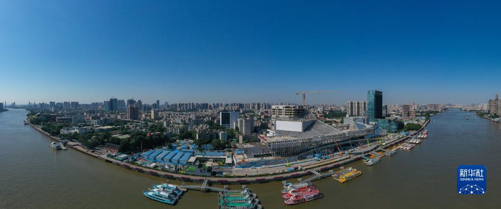 广东美术馆、广东非物质文化遗产展示中心、广东文学馆“三馆合一”建筑长350米,高近80米,宛如一艘“文化巨轮”扬帆珠江(10月12日摄,无人机全景照片)。