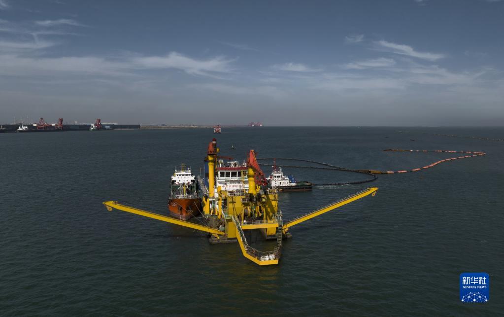 10月8日,施工船在唐山港京唐港区第四港池25万吨级航道工程建设工地施工(无人机照片)。新华社记者 杨世尧 摄