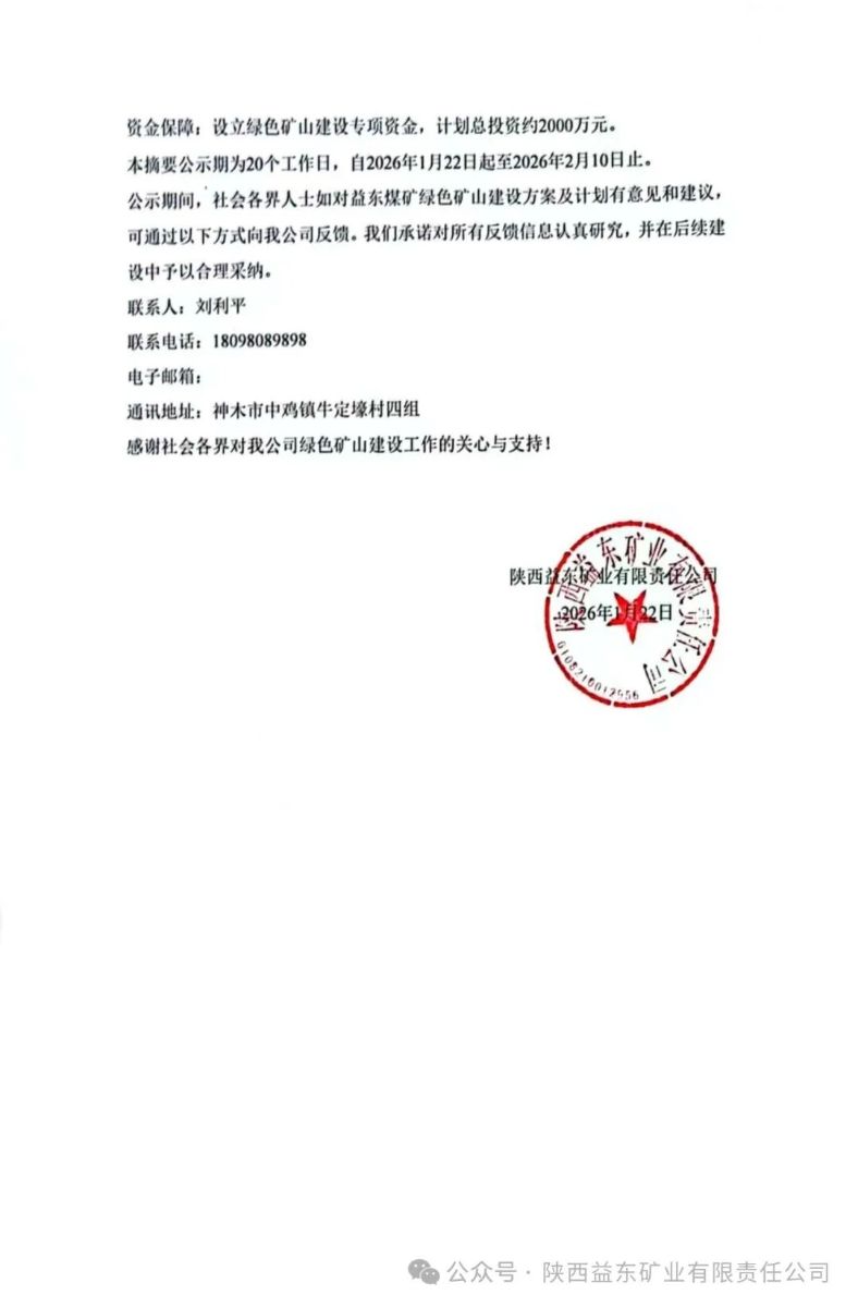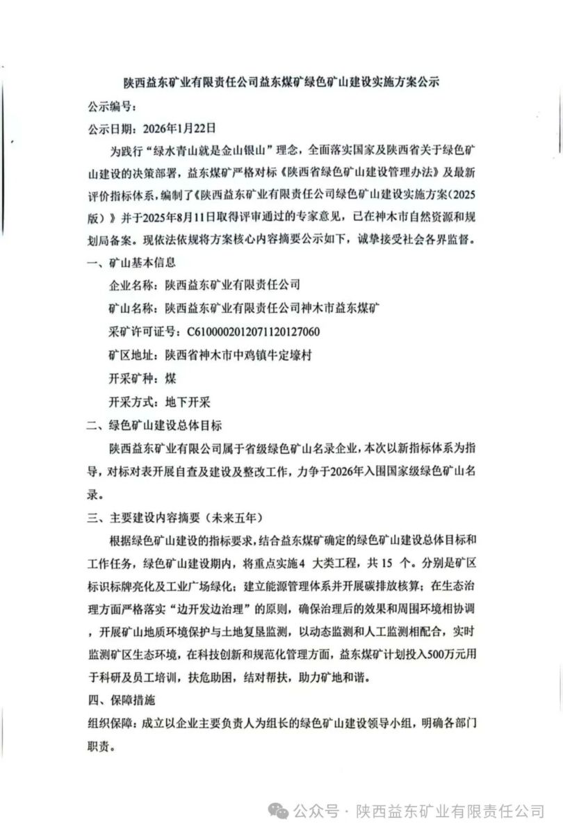 陕西益东矿业有限责任公司益东煤矿绿色矿山建设实施方案公示